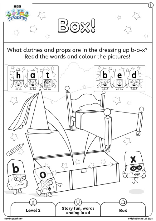Alphablocks, a dressing-up box - it must be show time! B, O and X discover a dressing-up box that is filled with everything they need to put on a performance of Sleeping Beauty, except for something to sleep on. This episode has fun with a host of letters and the words box, hag, red, ted and bed.