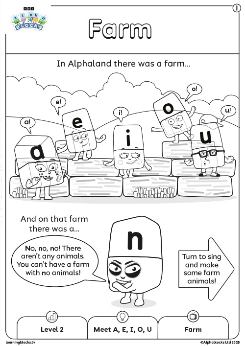 'In Alphaland, there was a farm, A, E, I, O, U', sing the Alphablock vowels. But N complains that there are no animals on their farm. When a JET appears, he protests that it is not an animal. Then a cow parachutes out. To N’s astonishment, a ZIP, a bubble that goes POP and a pool of MUD produce two hens, a sheep and a pig. The animals turn out to be divas and threaten to take over the chorus of the song, but N doesn’t mind. He’s delighted to have a proper farm at last.