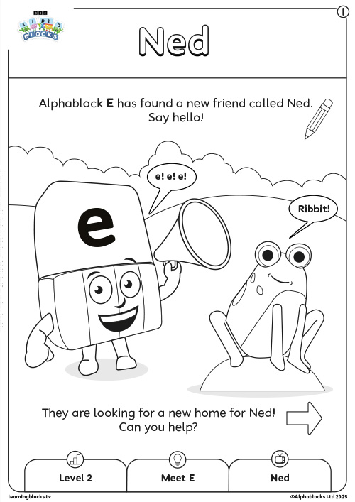 Alphablock E leads the search to find a home for his friend, Ned the frog. But Alphablock N doesn’t want to share his BED, a fox is already in the DEN, and a very cross HEN shuts Ned out of her PEN. Alphablock E decides to get advice from a VET, who helpfully points out that frogs like to live somewhere WET. Ned loves his pond. Success at last!