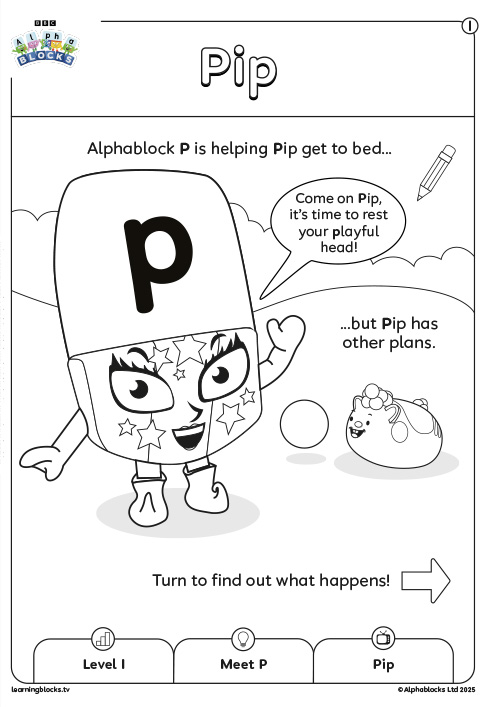 It’s time for bed, but Alphablock P’s adorable pet, Pip, just won’t settle down. With help from her friends, P tries to get Pip to SIT, to settle her with a PAT, and to give her a drink from a TAP. Alphablock P and her helpers are exhausted and need a NAP. At last, Pip joins them and falls asleep too... or does she?