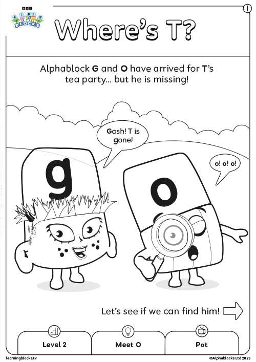 Alphablock T has mislaid his teapot and wanders off to find it. So, when Alphablocks O and G arrive for tea, they decide to go look for him. They get help from a DOG, but they lose it. They travel on a LOG in search of the dog. Eventually, they manage to create a smelly BOG, which attracts the dog. At last, the dog finds Alphablock T, who is lost in a FOG. They help T find his missing POT, then they all settle down to a cuppa, which is just right and not too hot!