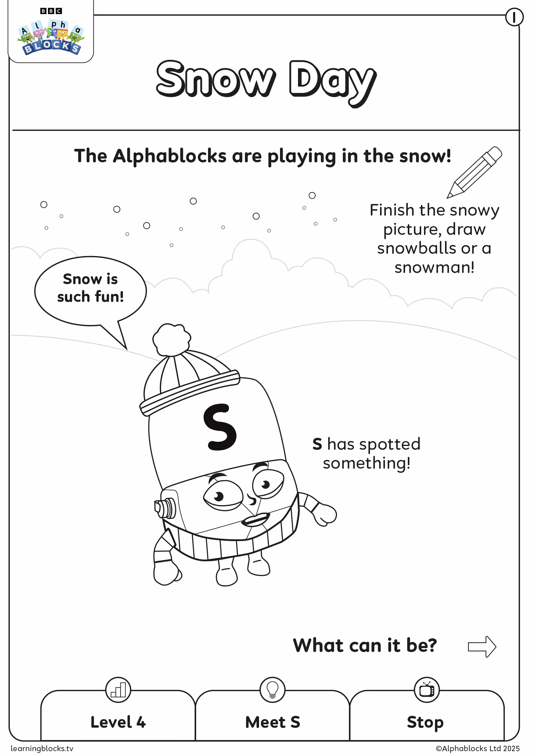 It’s a snowy day, and Alphablock S is enjoying a ride on a SLED, when she hits a bump and her letter pops out of her dome. Now, S can’t make her ‘s’ sound any more. Her mischievous letter doesn’t want to be caught and enjoys making her friends SLIP and SKID in the snow. Alphablock O has an idea. T challenges the letter S to a race up the hill. The other letters arrive at the TOP first, and then jump out to grab the ‘s’ to make STOP. Now, they can put it back in the right SPOT in S’s dome.